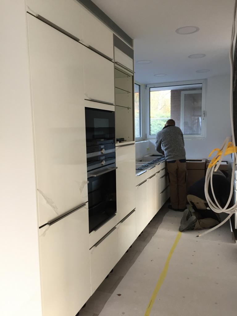 Die Küche wurde durch eine neue Küche, die von raum in form geplant wurde, ersetzt und mit Schiebetüren zu den anderen Räumen versehen. Im Flur wurde der Durchgang Richtung Wohnbereich und die Decke durch eine hinterleuchtete Spanndecke optisch aufgewertet. Sowohl das Gäste- als auch das Masterbad wurden erneuert und modernisiert.