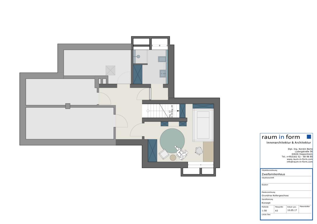 „raum-in-form- Innenarchitektur & Architektur“ wurde von den neuen Eigentümern des Objekts bereits am Anfang mit sämtlichen Leistungsphasen (LP 1-LP 8) beauftragt und hat im ersten Schritt ein genaues Aufmaß des Gebäudes vorgenommen und anschließend verschiedene Konzeptplanungen einschließlich verschiedener Einrichtungskonzeptionen und Gestaltungsvorschlägen hinsichtlich der Möblierung und der Farb- und Materialauswahl entwickelt. Anschließend wurde ein ganzheitliches Konzept für die durchzuführende Kernsanierung erarbeitet, dass auch die zu erstellenden Ausführungsplanungen sowie die Ausschreibung und Vergabe umfasste.